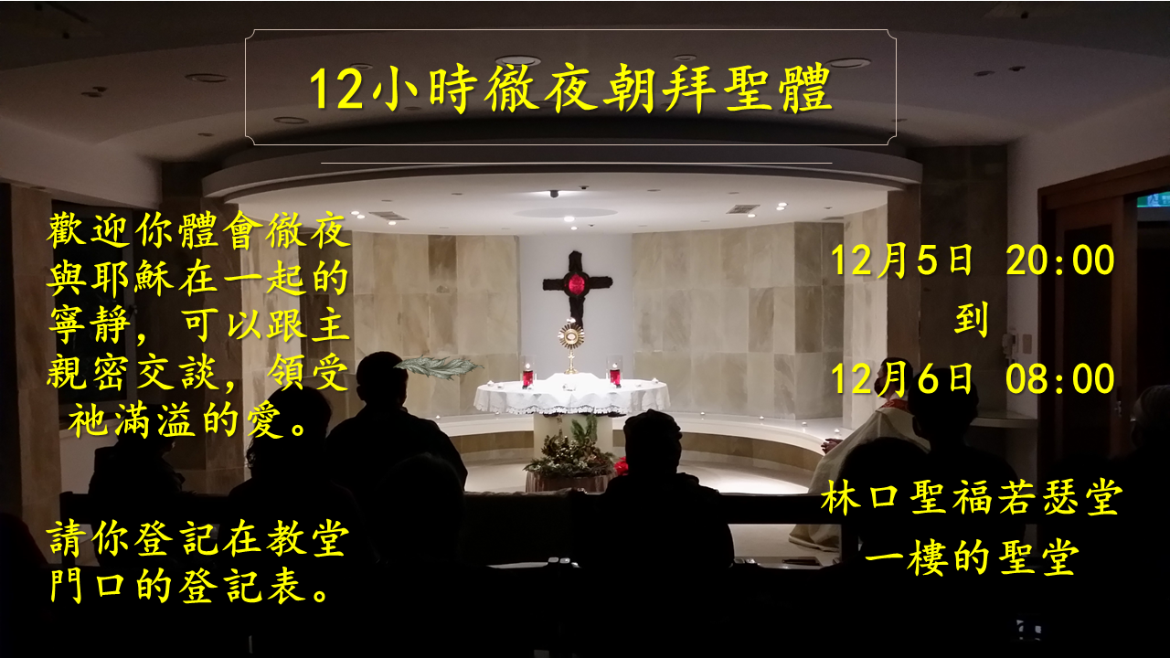 19:30 平日彌撒 20:00 12小時徹夜朝拜聖體→需至聖堂大門處登記 |