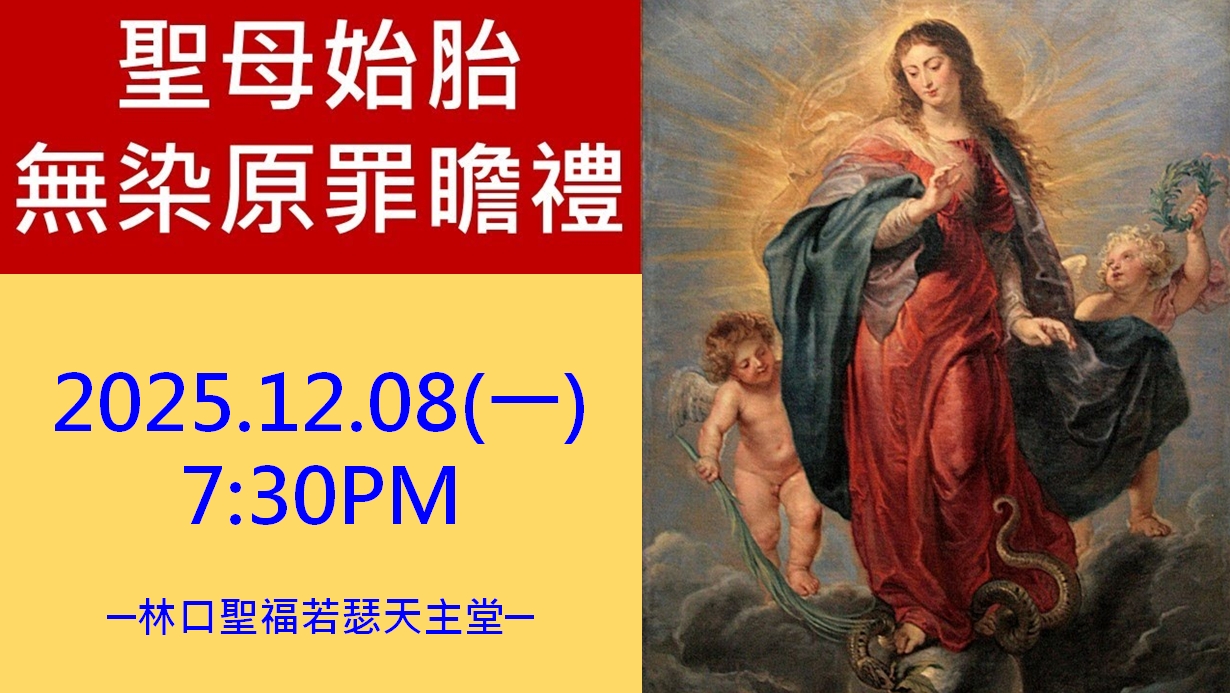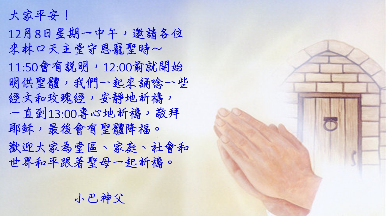 11:50 來聖堂守恩寵聖時 19:30 聖母始胎無染原罪瞻禮 |