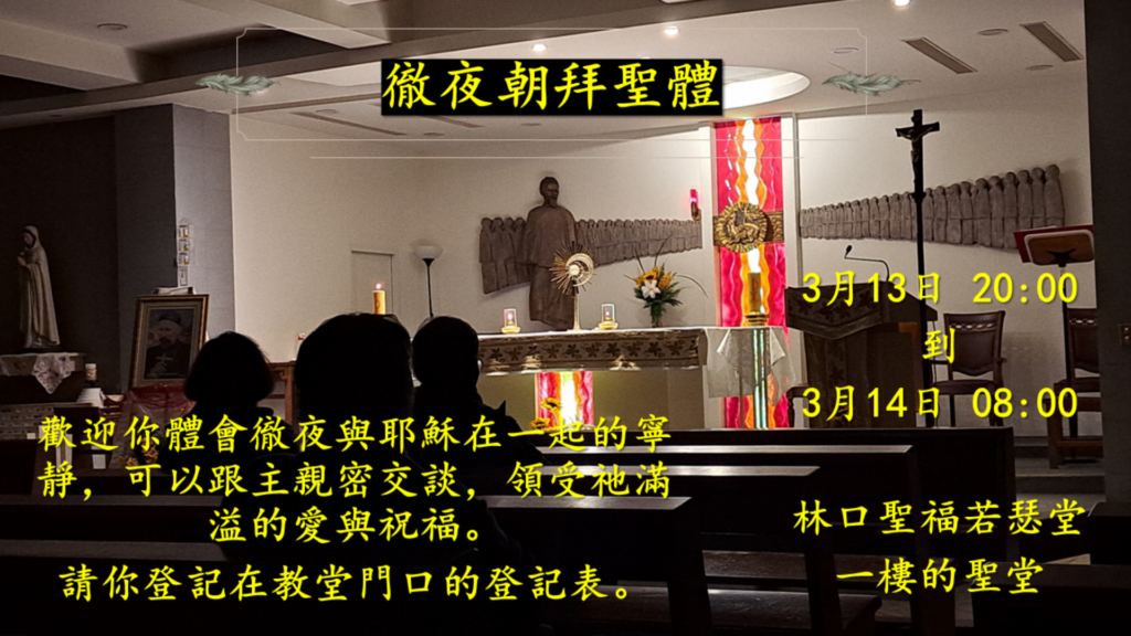 | 2026/03/13-14(五-六) | 3/13 19:00 拜苦路 3/13 19:30 平日彌撒 3/13 20:00 12小時徹夜朝拜聖體,請至教堂門口登記。感謝! 3/14 08:00 平日彌撒 |